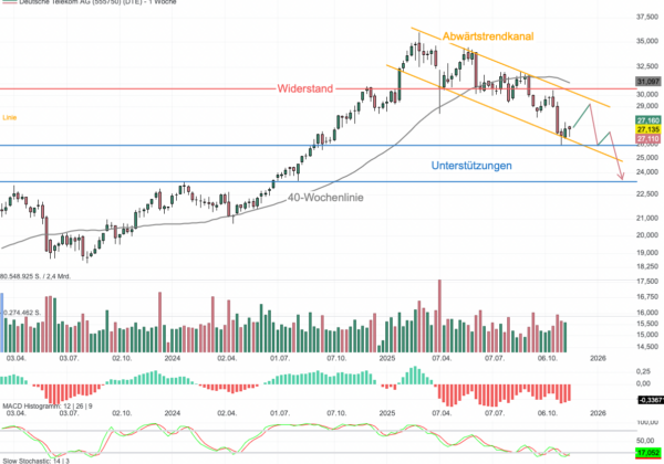 Die Deutsche Telekom-Aktie steckt seit März 2025 in einem Abwärtstrendkanal. Steht eine kurzfristige Erholung bevor oder dominiert die bärische Tendenz?