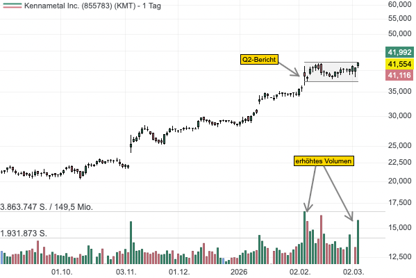 Kennametal ist ein Entwickler von industriellen Hochleistungsmaterialien und extrem verschleißfesten Komponenten. Es hat sich insbesondere auf Lösungen aus Hartmetall und Wolframkarbid spezialisiert. Es gibt mehrere Gründe, warum ich denke, dass man genau jetzt einen Trade eingehen kann: Seit den starken Quartalszahlen von Anfang Februar kommt immenses Volumen in die Aktie, was für institutionelles...