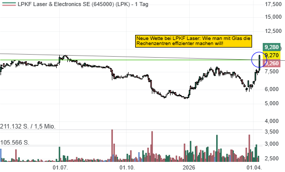 Bei den Aktien am 52-Wochenhoch sticht das Momentum von LPKF Laser heraus. Das Unternehmen liefert Präzisionswerkzeuge für die Elektronikfertigung, die Strukturierung von Solarzellen und das Laserschweißen von Kunststoffen. Während das Kerngeschäft 2025 mit einem Umsatz von 115,3 Mio. Euro (-6,2%) und einer bereinigten EBIT-Marge von 0,0% operativ stagnierte, verschiebt sich der Investment-Fokus...