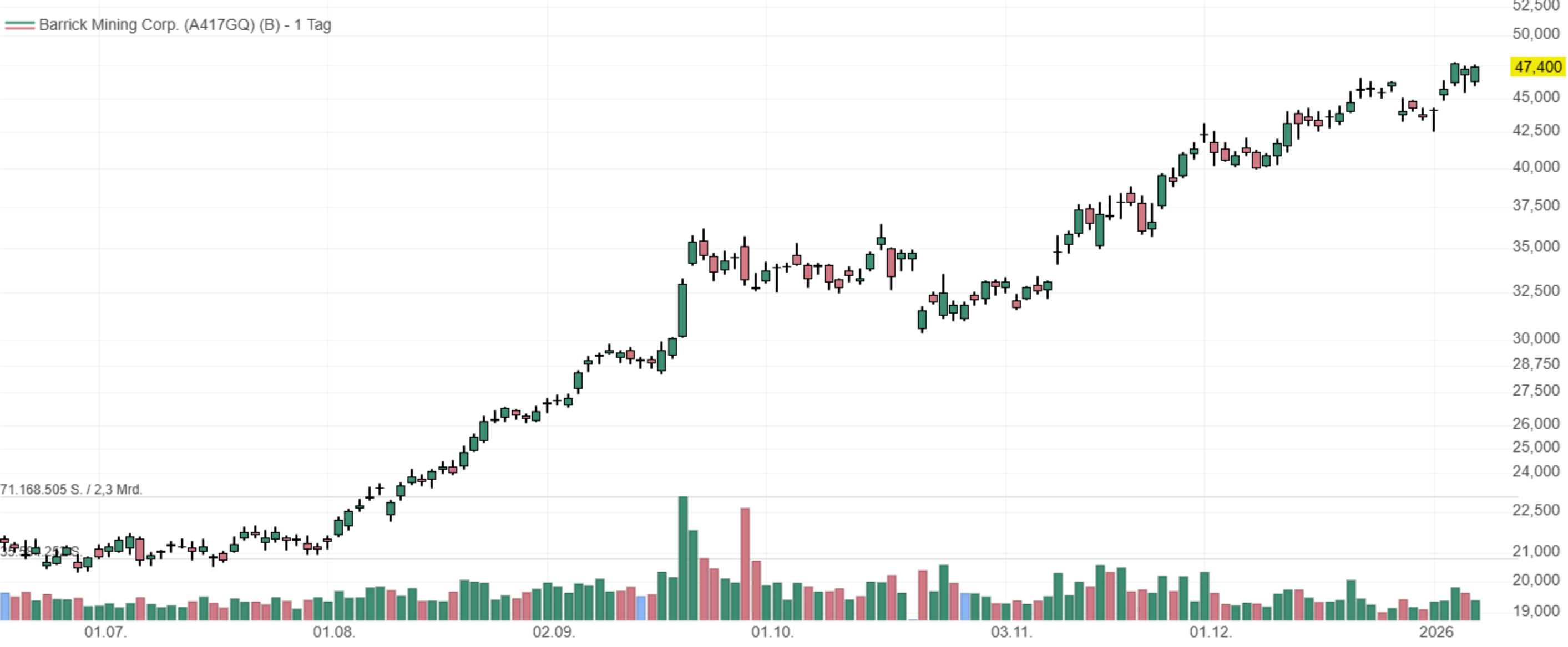 In den letzten 52 Wochen hat die Aktie von Barrick Mining eine Rendite von 200 % erzielt. In den vergangenen vier Wochen lag die Rendite bei 16 % . Die Aktie markierte das 52-Wochenhoch am 08.01.2026 bei 47,52 USD. Das 52-Wochentief markierte die Aktie am 14.01.2025 bei 15,31 USD. Seitdem konnte sich die Aktie auf 47,43 USD erholen und damit um 210 % seit Tief zulegen.