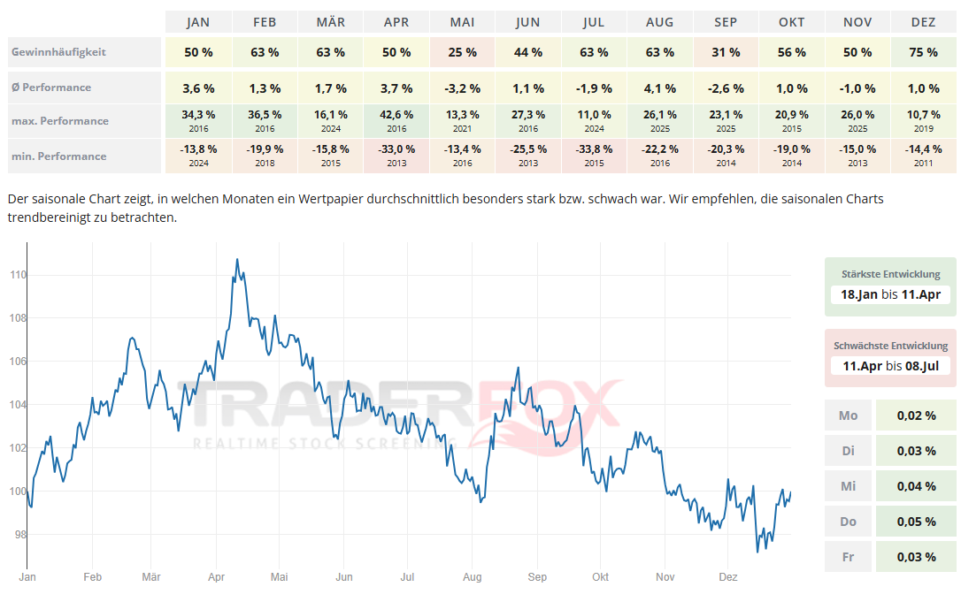 Der Zeitraum mit der stärksten Entwicklung dauert von Anfang Januar bis Mitte April. Der April ist dabei mit einer durchschnittlichen Performance von 3,7 % und einer Gewinnhäufigkeit von 50 % auffällig. Auch der Monat August kann mit einer durchschnittlichen Performance von 4,1 % und einer Gewinnhäufigkeit von 63 % überzeugen.