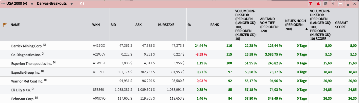 Eine weitere Möglichkeit besteht darin, das Template "Darvas-Breakouts" in unserem Tool "AKTIEN-RANKINGS" zu öffnen. Dieses findet man unter der Rubrik Trader-Zeitung.