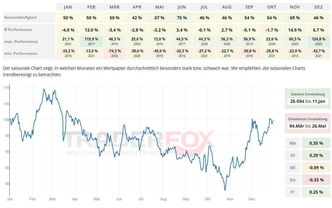 Der Zeitraum mit der stärksten Entwicklung dauert von Ende Oktober bis Anfang Januar. Der November ist dabei mit einer durchschnittlichen Performance von 14,9 % und einer Gewinnhäufigkeit von 69 % auffällig. Auch der Monat Februar kann mit einer durchschnittlichen Performance von 13 % und einer Gewinnhäufigkeit von 50 % überzeugen.