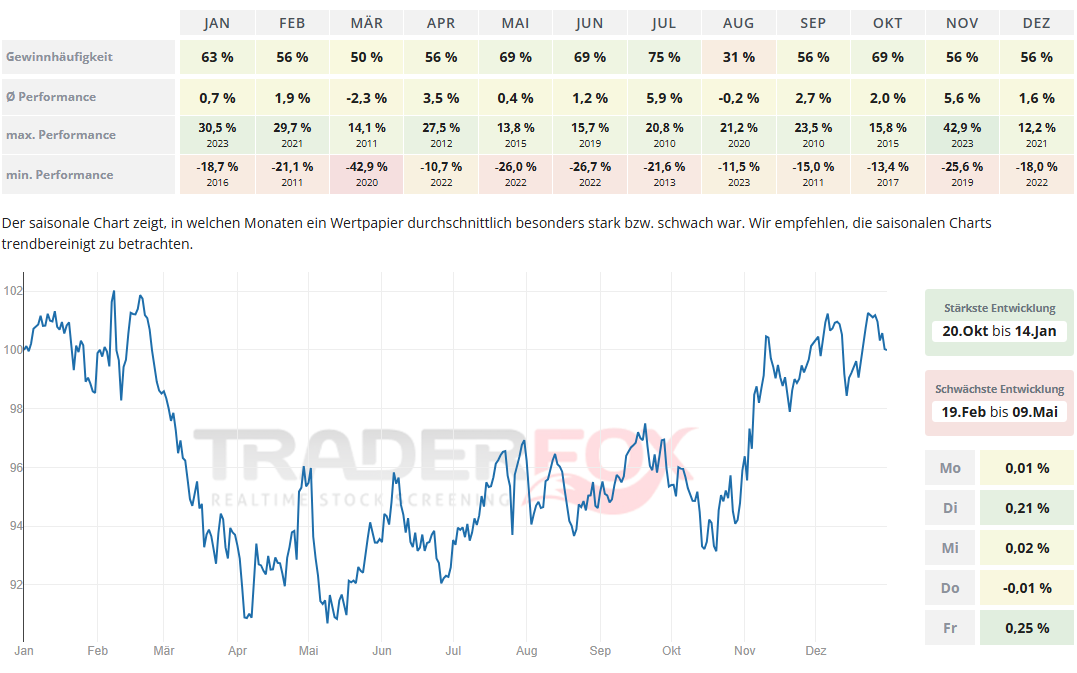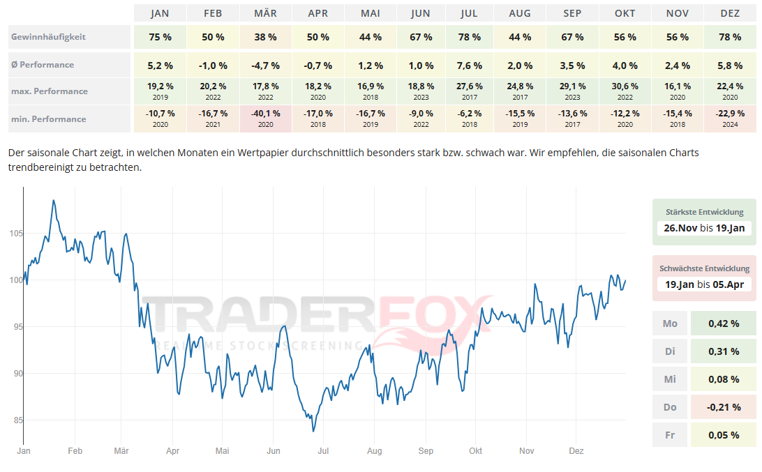 Der Zeitraum mit der stärksten Entwicklung dauert von Ende Oktober bis Mitte Januar. Der November ist dabei mit einer durchschnittlichen Performance von 5,6 % und einer Gewinnhäufigkeit von 56 % auffällig. Auch der Monat Juli kann mit einer durchschnittlichen Performance von 5,9 % und einer Gewinnhäufigkeit von 75 % überzeugen.