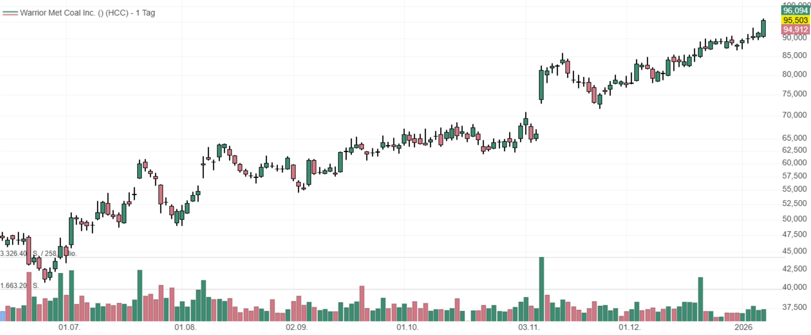In den letzten 52 Wochen hat die Aktie von Warrior Met Coal eine Rendite von 82 % erzielt. In den vergangenen vier Wochen lag die Rendite bei 18 %. Die Aktie markierte das 52-Wochenhoch am 08.01.2026 bei 96,10 USD. Das 52-Wochentief markierte die Aktie am 07.04.2025 bei 38,00 USD. Seitdem konnte sich die Aktie enorm erholen und um 152 % seit Tief zulegen.