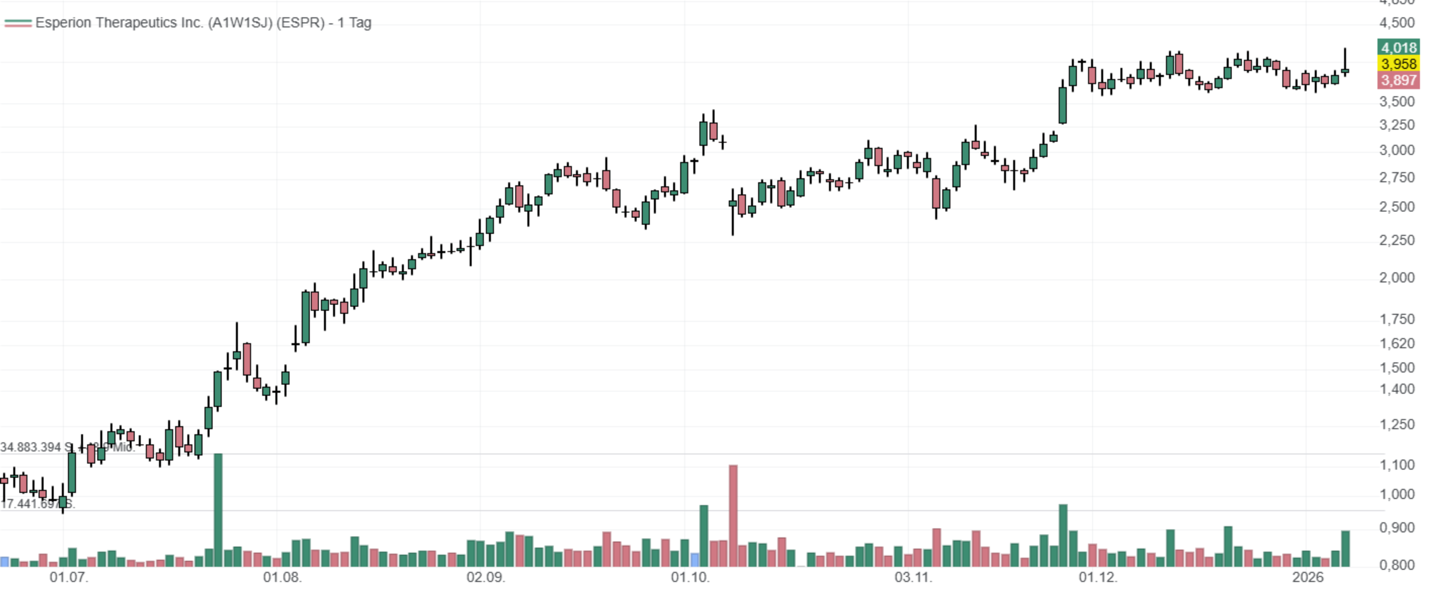 In den letzten 52 Wochen hat die Aktie von Esperion Therapeutics eine Rendite von 80 % erzielt. In den vergangenen vier Wochen lag die Rendite bei 3,4 %. Die Aktie markierte das 52-Wochenhoch am 08.01.2026 bei 4,16 USD. Das 52-Wochentief markierte die Aktie am 15.05.2025 bei 0,69 USD. Seitdem konnte sich die Aktie erholen und damit um 466 % seit Tief zulegen.