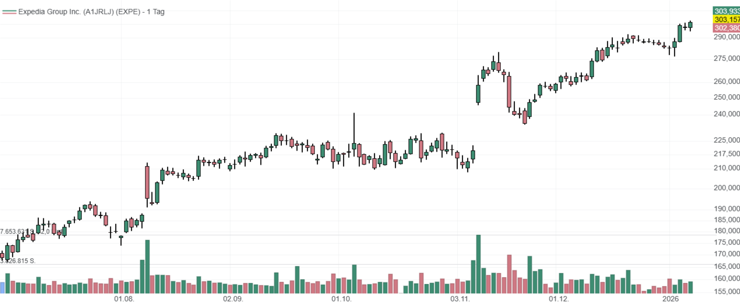 In den letzten 52 Wochen hat die Aktie von Expedia Group eine Rendite von 65 % erzielt. In den vergangenen vier Wochen lag die Rendite bei 15 %. Die Aktie markierte das 52-Wochenhoch am 08.01.2026 bei 302,15 USD. Das 52-Wochentief markierte die Aktie am 07.04.2025 bei 130,01 USD. Seitdem konnte sich die Aktie kräftig erholen und um 132 % seit Tief zulegen.
