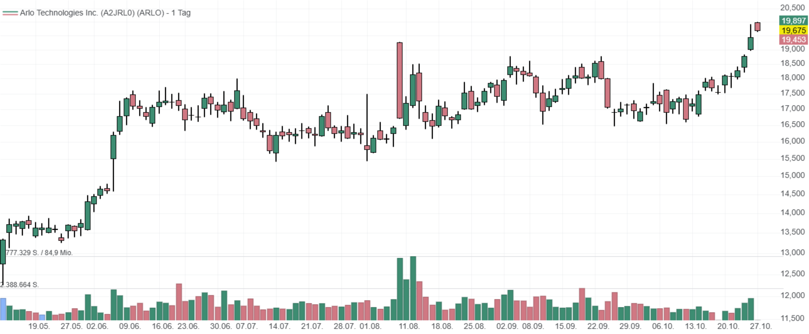 In den letzten 52 Wochen hat die Aktie von Arlo Technologies eine Rendite von 80 % erzielt. In den vergangenen vier Wochen lag die Rendite bei 15 %. Die Aktie markierte das 52-Wochenhoch am 27.10.2025 bei 19,91 USD. Das 52-Wochentief markierte die Aktie am 04.04.2025 bei 7,84 USD. Seitdem konnte sich die Aktie stark erholen und damit um 152 % seit Tief zulegen.