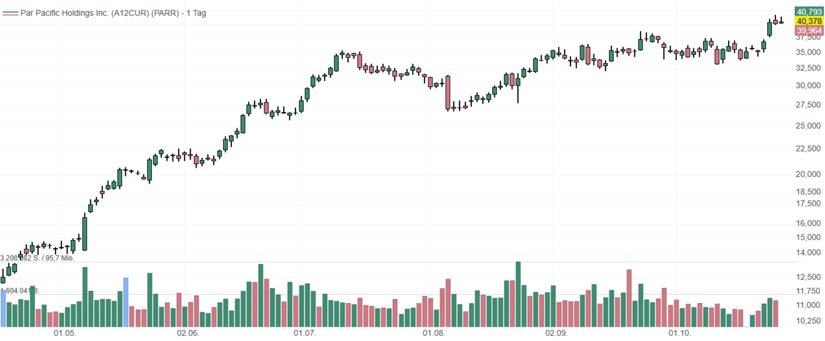 In den letzten 52 Wochen hat die Aktie von Par Pacific Holdings eine Rendite von 140 % erzielt. In den vergangenen vier Wochen lag die Rendite bei 14 %. Die Aktie markierte das 52-Wochenhoch am 24.10.2025 bei 41,64 USD. Das 52-Wochentief markierte die Aktie am 05.03.2025 bei 11,86 USD. Seitdem konnte sich die Aktie kräftig erholen und um 244 % seit Tief zulegen.