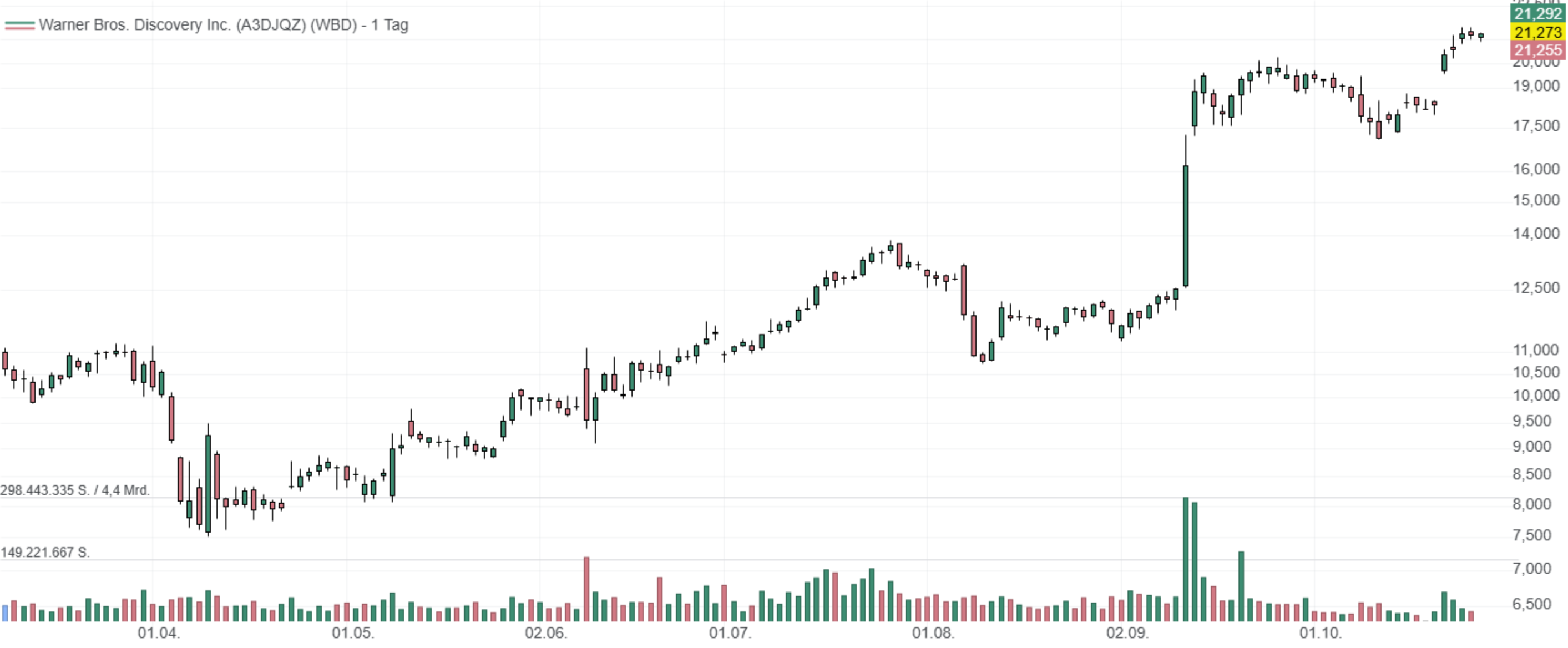 Die Aktie von Warner Bros. Discovery legte am 11.09.2025 um zwischenzeitlich rund 35 % zu, nachdem berichtet wurde, dass Paramount Skydance ein Mehrheitsangebot für den Unterhaltungsriesen vorbereitet. Das Angebot bezieht sich laut einem Bericht des Wall Street Journal auf das gesamte Unternehmen, einschließlich der Kabelnetze und des Filmstudios. Das Angebot wird von der Familie Ellison (Oracle) unterstützt. Das mögliche Angebot folgt auf die Bestätigung von Warner Bros. im Juni, dass das Unternehmen sich in zwei Unternehmen aufteilen wird, wobei sich eines auf Streaming und das andere auf seine Fernsehsender konzentriert. Ein Deal würde Paramounts CBS News mit Warner Bros. CNN sowie Warner Bros. Studio mit Paramount Studio zusammenführen.