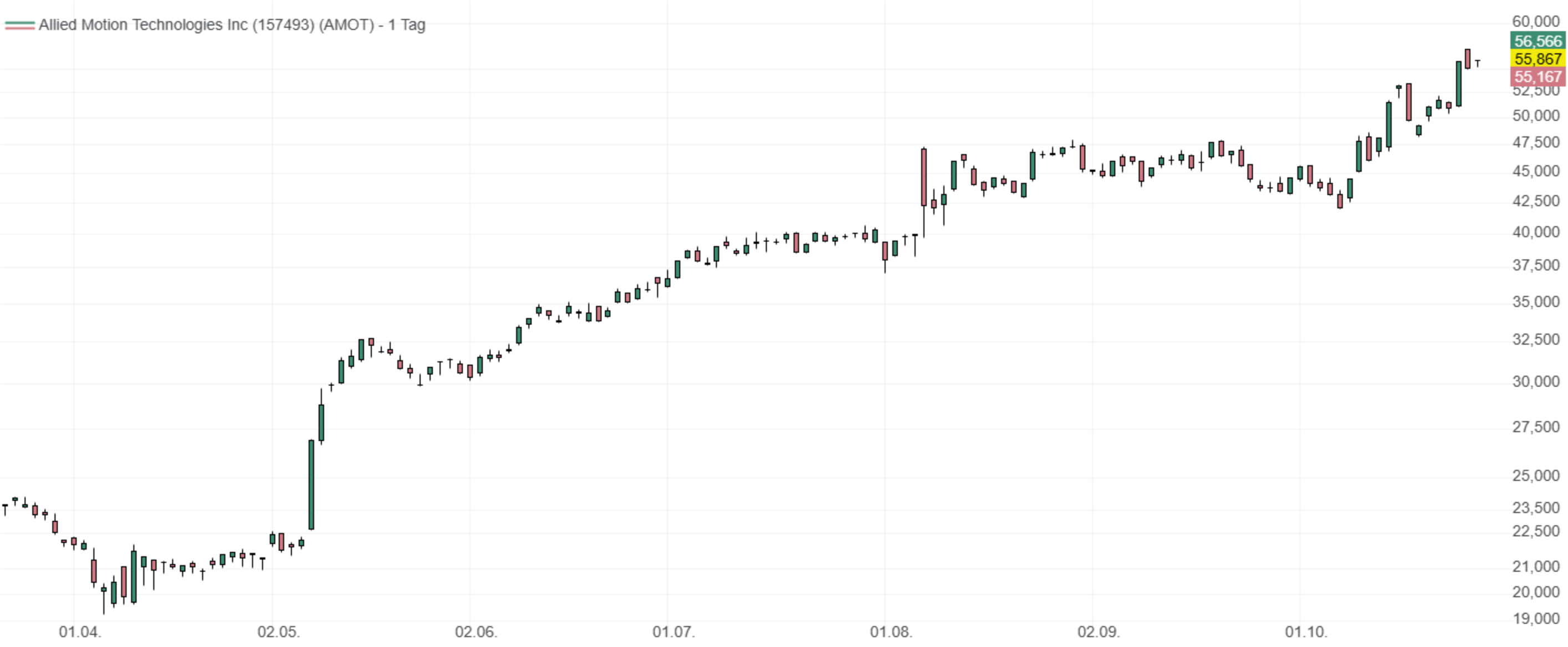 In den letzten 52 Wochen hat die Aktie von Allient eine Rendite von 210 % erzielt. In den vergangenen vier Wochen lag die Rendite bei 29 %. Die Aktie markierte das 52-Wochenhoch am 24.10.2025 bei 57,00 USD. Das 52-Wochentief markierte die Aktie am 23.10.2024 bei 16,94 USD. Seitdem konnte sich die Aktie kräftig erholen und um rund 230 % seit Tief zulegen.