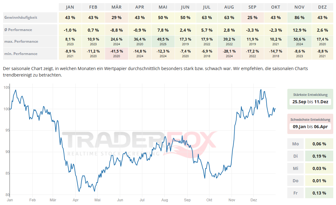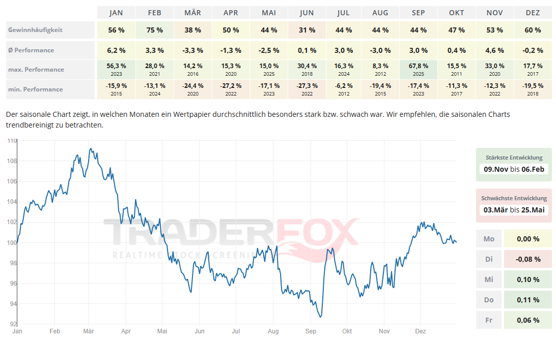 Der Zeitraum mit der stärksten Entwicklung dauert von Ende September bis Mitte Dezember. Der November ist dabei mit einer durchschnittlichen Performance von 12,9 % und einer Gewinnhäufigkeit von 86 % auffällig. Auch der Monat Mai kann mit einer durchschnittlichen Performance von 7,8 % und einer Gewinnhäufigkeit von 50 % überzeugen.