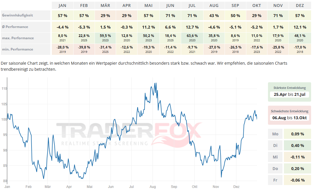Die beste Entwicklung liefert die Aktie von Ende April bis Ende Juli. Der Juli sticht hierbei mit einer durchschnittlichen Performance von 12,7 % heraus. Die Gewinnhäufigkeit ist dabei mit 71 % ebenfalls solide. Auch der Dezember zeigt sich mit einer durchschnittlichen Performance von 12,1 % und einer Gewinnhäufigkeit von 57 % freundlich.