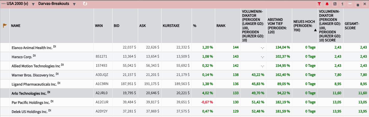 Eine weitere Möglichkeit besteht darin, das Template "Darvas-Breakouts" in unserem Tool "AKTIEN-RANKINGS" zu öffnen. Dieses findet man unter der Rubrik Trader-Zeitung.