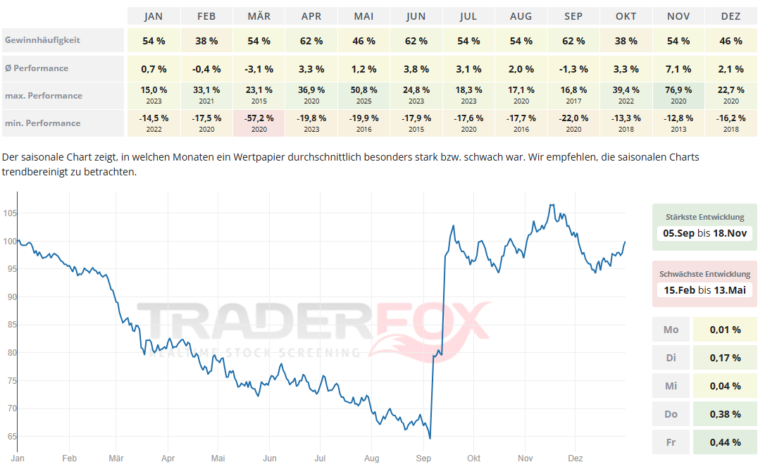 Der Zeitraum mit der stärksten Entwicklung dauert von Anfang September bis Mitte November. Der November ist dabei mit einer durchschnittlichen Performance von 7,1 % und einer Gewinnhäufigkeit von 54 % auffällig. Auch der Monat Juni kann mit einer durchschnittlichen Performance von 3,8 % und einer Gewinnhäufigkeit von 62 % überzeugen.