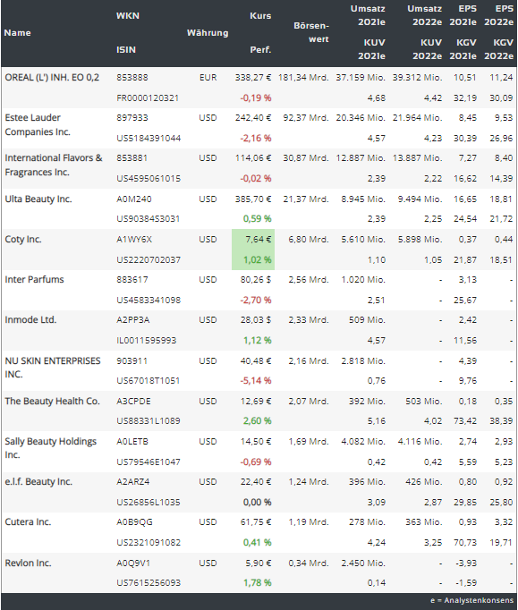 Doch nun ist die Welt im Großen und Ganzen für eine globale Re-Opening bereit, was ausschließlich allen Beauty-Firmen eine deutlich bessere Nachfrage bescheren dürfte. Und so stehen die Chancen gut, dass wir demnächst eine Erholung in der Kosmetikindustrie sehen werden. Aus diesem Grund erstellen wir heute eine Watchlist aus Top-Beauty-Stocks, die man angesichts der globalen Wachstumsperspektive und der bald anlaufenden Re-Opening u.a. auch im stationären Handel (auch in China) im Blick haben sollte.