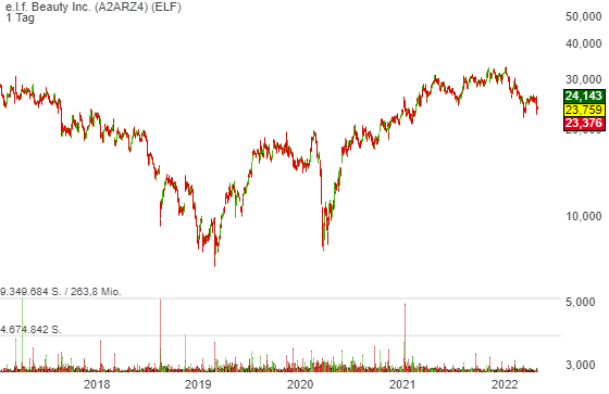 Die Nummer drei ist heute die Aktie von e.l.f. Beauty (ELF). E.l.f. ist die Abkürzung für engl. Augen, Lippen, Gesicht. Es ist eine amerikanische Kosmetikmarke mit Sitz in Kalifornien, die an der Entwicklung und dem Verkauf mehrerer Produktlinien arbeitet. Das Unternehmen richtet sich hauptsächlich an den täglichen Verbraucher, da es nach wie vor ein beliebter Markenname in der Welt der Kosmetik ist. Zu den kosmetischen Produkten gehören Hautpflegeprodukte, Eyeliner, Lippenstifte, Glossen, Pinsel, Rouge, Bronzer, Badeprodukte, Make-up auf Mineralbasis und vieles mehr. Darüber hinaus behauptet die Marke, dass ihre Produkte zu 100 % tierversuchsfrei sind, was für viele Konsumenten gerade in der westlichen Welt eine immer wichtigere Rolle spielt.