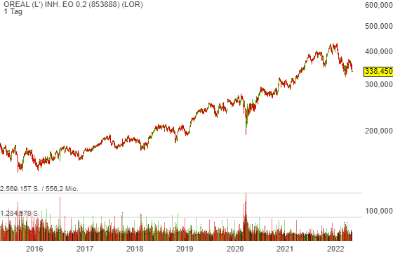 Der Q1-Umsatz verbesserte sich dabei auf der Konzernebene um 19 % auf 9,06 Mrd. Euro. Auf vergleichbarer Basis verbesserten sich die Umsatzerlöse um 13,5 %, während der Analystenkonsens hier von einem Umsatzanstieg von 11,7 % ausgegangen war. Deutliche Zuwächse im zweistelligen Prozentbereich hatte man dabei vor allem im hochpreisigen Segment L’Oreal Luxe (17,5 %) zu verzeichnet, während man bei Professional Products (+17,6 %) und im Segment Active Cosmetics (+18,0 %) ebenfalls überdurchschnittlich stark zulegen konnte. Im Consumer-Segment wuchs man in Q1 mit +6,9 % ebenfalls stärker als der Gesamtmarkt. Wie L’Oreal weiter ausführte, habe sich die steigende Inflation bislang nicht negativ auf das Kaufverhalten der Verbraucher ausgewirkt. Und so rechnet man nun für das laufende Fiskaljahr weiterhin damit, dass man trotz der schwierigen Rahmenbedingungen und der Russland/Ukraine-Krise stärker als der Gesamtmarkt wachsen werde.