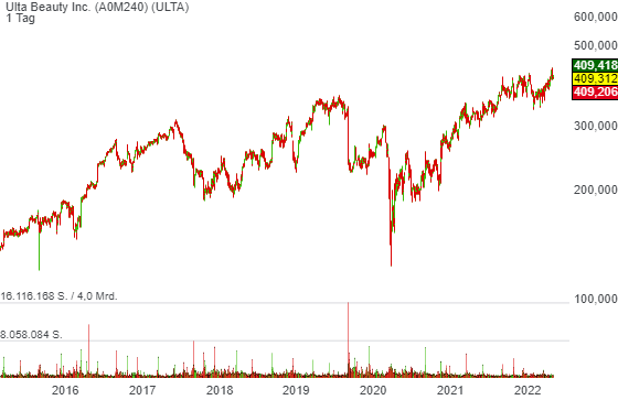 Der letzte signifikant positive Impuls kam hier Mitte März als ULTA starke Q4-Zahlen vorgelegt hat. Der Q4-Usmatz stieg dabei im Vergleich zum Vorjahreswert um 24,1 % auf 2,7 Mrd. USD (Konsens: 2,69 Mrd. USD). Das EPS von 5,41 USD fiel deutlich besser als die erwarteten 4,58 USD aus. Die Same-Store-Sales verbesserten sich um 21,4 %. Und so hat der Konzern im Anschluss auch eine solide Jahresprognose offeriert. Das EPS22 wird nun bei 18,20-18,70 USD (Konsens: 17,84 USD) bei einem Umsatz von 9,05-9,15 Mrd. USD (Konsens: 9,14 Mrd. USD) erwartet.