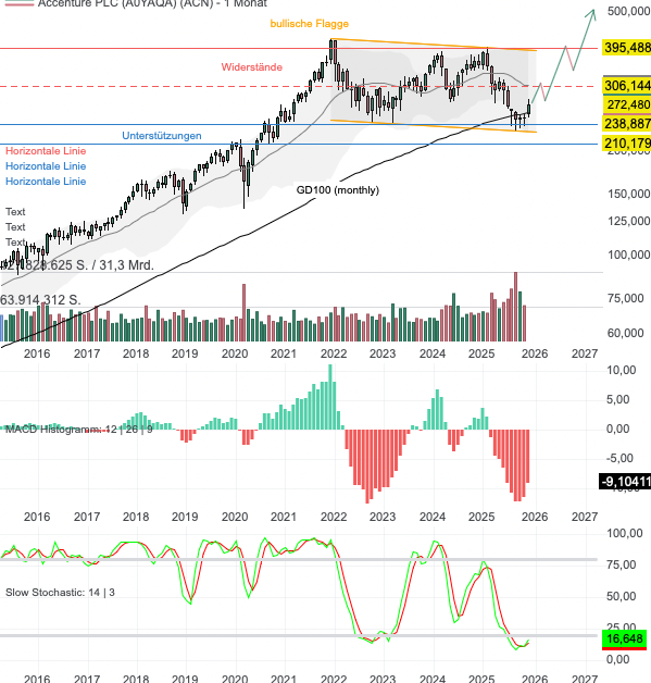 Aus charttechnischer Sicht befindet sich Accenture innerhalb einem übergeordneten, langjährigen Aufwärtstrend. Allerdings ging die Aktie seit 2022 in eine mehrjährige Konsolidierung in Form eines Trendkanals über. Wird dieser Trendkanal nach oben durchbrochen, entsteht ein (Aufwärts-)Trendfortsetzungssignal. Der Kanal wird zur bullischen Flagge. Im Rahmen der Korrektur der letzten Monate steuerte die Aktie die Unterkante dieses Kanals an und baute die überkaufte Situation in der Slow Stochastik an. Gestützt vom GD100 (monthly) konnten mehrere Umkehr-Dojis und erste Kaufsignale in der Slow Stochastik generiert werden. Dies verstärkt die Bedeutung der Unterstützung und die Chancen auf einen Turnaround. Die nächsten Kursziele befinden sich bei 306 USD, gefolgt von 395 USD. Kann in diesem Zuge der Kanal überwunden werden, notiert das nächste Ziel bei 500 USD. Sollte Accenture hingegen unter 238 USD fallen, verstärkt sich die Korrektur. Die nächste Auffangzone befindet sich dann bei 210 USD.