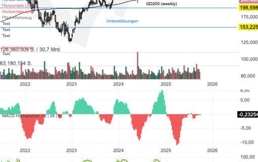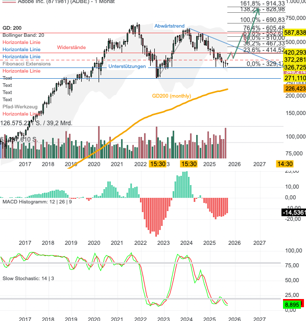 Aus charttechnischer Sicht zeigt Aktie von Adobe auf Monatsbasis eine vielversprechende Bodenbildung. Nach einem Rücksetzer bis zur Unterstützung bei 271 USD konnte sich der Kurs stabilisieren und bewegt sich nun in Richtung des Widerstands bei 372 USD. In den letzten Monaten versucht Adobe eine zusätzliche Unterstützung bei 326 USD zu etablieren. Gelingt es Adobe über den Widerstand bei 372 USD anzusteigen, befinden sich die nächsten Kursziele bei 414 USD gefolgt von den relevanten Fibonacci-Extensions bei ca. 600 USD, gefolgt von 828 und 914 USD. Wichtige Unterstützungen liegen bei 326 USD und 271 USD. Ein Bruch unter 271 USD würde das bullische Szenario gefährden. Das Volumen zeigt in den letzten Monaten eine moderate Zunahme, was auf wachsendes Interesse hindeutet. Die Slow Stochastik bewegt sich aktuell aus dem überverkauften Bereich nach oben und unterstützt damit das positive Momentum. Auch das MACD-Histogramm zeigt erste Stabilisierungen, was auf eine beginnende Trendwende hindeutet.
