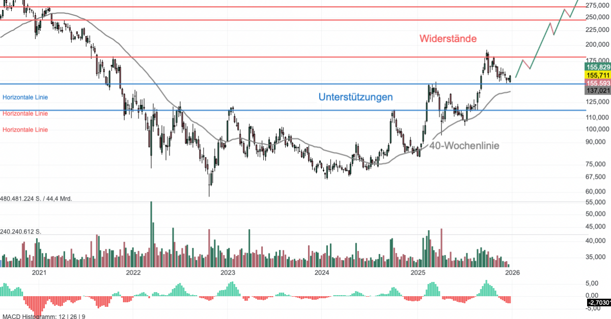 Der Chart der Aktie von Alibaba (BABA) liefert ein sehr spannendes Bild für die kommenden Monate. Der Kurs notiert aktuell deutlich über der 40-Wochenlinie (aktuell 137 USD), was langfristig ein bullisches Signal darstellt. Wir sehen eine solide Basis im Bereich von 145 USD. Der nächste markante Widerstand liegt bei 182 USD. Ein nachhaltiger Ausbruch darüber würde den Weg in Richtung der psychologisch wichtigen 300-USD-Marke und zu den Rekordhochs ebnen. Die Slow Stochastic befindet sich im unteren Bereich (überverkauft), was oft auf eine bevorstehende Gegenbewegung nach oben hindeutet. Der Chart zeigt einen Befreiungsschlag aus der jahrelangen Bodenbildung. Die Aktie versucht gerade, eine neue Rallye in Richtung 180 USD zu zünden. Solange die Marke von 145 USD hält, bleibt das Szenario konstruktiv.