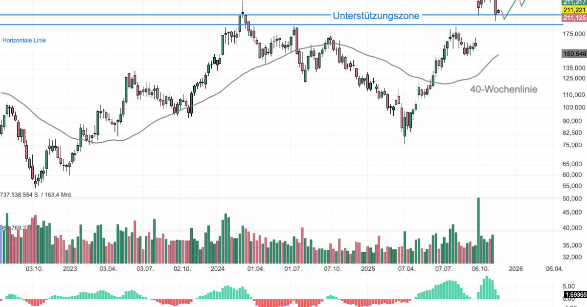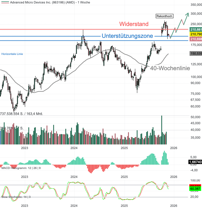 Die Aktie von Advanced Micro Devices (AMD) befindet sich in einem langfristigen Aufwärtstrend. Nach einer Korrektur in 2024 hat der Kurs 2025 eine deutliche Erholung gezeigt und ist bis auf ein Rekordhoch von 267 USD angestiegen. Nach dem Erreichen des Rekordhochs erfolgte eine Korrektur. Der Kurs hat aktuell die eingezeichnete Unterstützungszone getestet. Die Zone liegt zwischen 187 und 203 USD. Dieses Niveau hat historisch eine wichtige Rolle gespielt und bildet die aktuelle kritische Unterstützung. Ein Halten ist für die Fortsetzung des Aufwärtstrends essenziell. Der nächste Widerstand befindet sich bei 227 USD. Ein Überwinden dieses Niveaus ist notwendig, um das Rekordhoch anzugreifen. Die 40-Wochenlinie fungiert als wichtiger langfristiger Trendindikator. Sie verläuft deutlich unter dem aktuellen Kursniveau und steigt an. Dies bestätigt den langfristigen Aufwärtstrend.