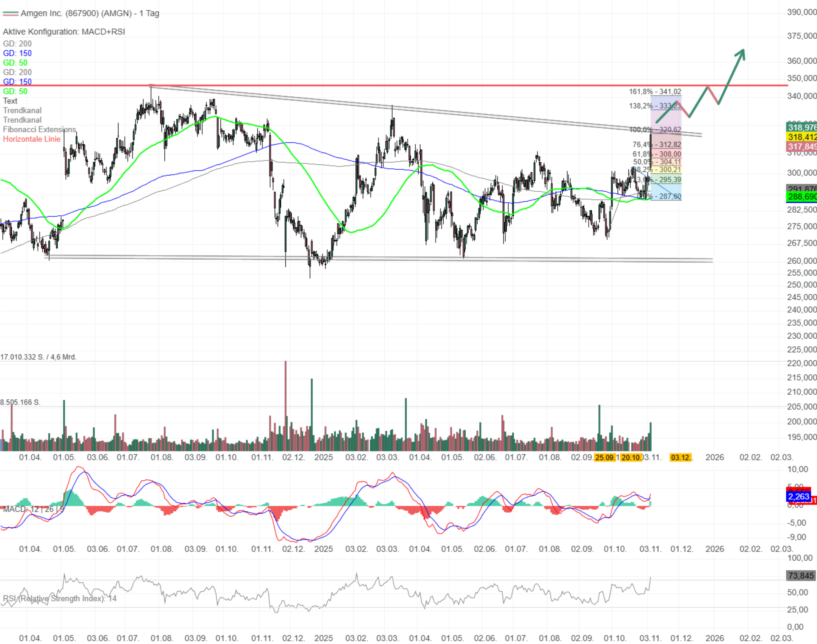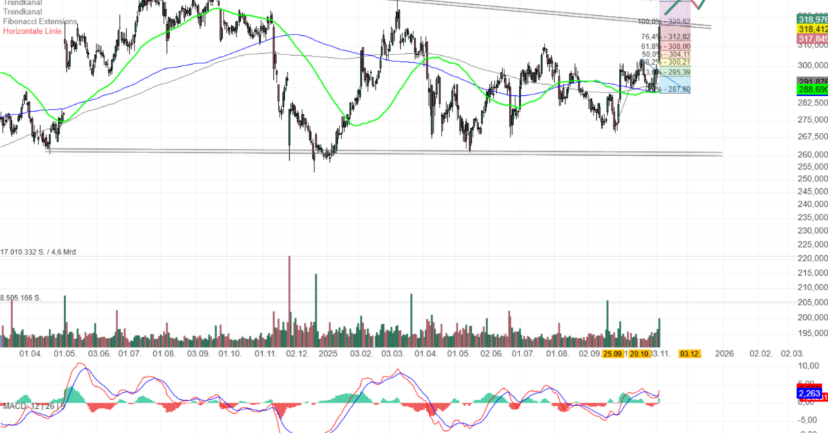 die Aktie von Amgen (WKN: 867900) signalisiert nach einer langen Seitwärtsphase einen potenziellen Trendschub. Der Kurs testet aktuell eine seit 2024 bestehende Abwärtstrendlinie im Bereich um 320 USD. Gleichzeitig bewegt sich die Aktie weg von den mittelfristigen GDs, was technischen Rückenwind bedeutet. Zudem signalisiert der MACD ein Kaufsignal und der RSI notiert im bullischen Bereich nahe der Überkauft-Schwelle, was zusätzliches Momentum verleiht. Die Umsätze steigen beim jüngsten Anstieg deutlich an; das spricht für institutionelles Interesse. Aus Fibonacci-Sicht wären nach erfolgreichem Ausbruch zunächst Ziele bei 333 USD und im erweiterten Szenario bei 341 USD (161,8%-Extension) realistisch. Über der breiten Widerstandszone um 320/333 USD, speziell aber über 347 USD könnte eine Trendbeschleunigung einsetzen, was ein attraktives CRV bietet. Erst unter 287 USD trübt sich das Bild signifikant ein; dort sollte ein Stopp platziert werden.