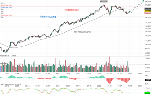 Anfang 2023 notierte die Aktie von Apple (AAPL) bei 124 USD. Nachdem die 40-Wochenlinie überwunden wurde, stieg das iPhone-Papier auf 198 USD. Nach einem Rücksetzer erfolgte der Angriff auf die 200 USD-Marke. Ein Ausbruch scheiterte und es kam zu einem Kursrückgang auf 164 USD. Nach einem Kaufsignal der Slow-Stochastik ging es bis Juli 2024 auf 237 USD nach oben. Es folgte eine Konsolidierung, bevor die Aktie im Dezember des Vorjahres ihr Rekordhoch bei 260,10 USD erreichte. In diesem Jahr folgte ein Kursrutsch bis 169 USD. Nach einer Erholungsbewegung bildete sich bei 214 USD ein Widerstand aus. Überwinden die Bullen diesen, wäre das der erste Befreiungsschlag. Die nächsten Hürden liegen nach der 40-Wochenlinie (222,53 USD) bei 225 und 250 USD. Ein Unterstützungsbereich befindet sich zwischen 189 und 199 USD.
