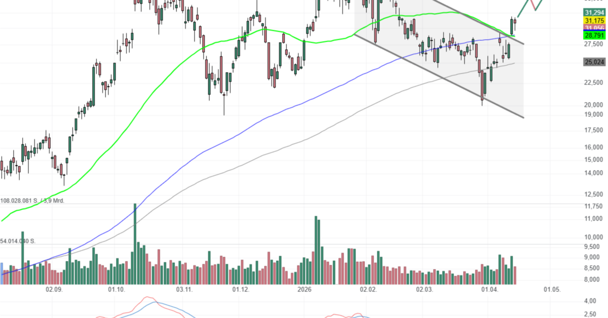 die Aktie von Applied Digital (WKN: A3DHHB) hat den Ausbruch aus dem mehrmonatigen fallenden Keil vollzogen. Der Chart zeigt eine nachhaltige Rückeroberung der gleitenden Durchschnitte, während der GD 50 noch abwärtsgerichtet ist. Der Fake-Breakout auf der Unterseite durch den GD200 wurde Ende März direkt gekontert, ein bullisches Zeichen. Der MACD unterstützt das bullische Szenario. Der RSI bei rund 60 bietet zudem reichlich Spielraum für weitere Zugewinne ohne sofortige Überhitzung. Der jüngste Vertrags-Deal mit CoreWeave über 250 MW Kapazität fungiert als fundamentales Sprungbrett für den Kurs. Als primäres Ziel definieren wir die Zone zwischen 40,00 und 42,50 USD. Zur Absicherung dient das Niveau bei 28,50 USD, welches knapp unter dem GD 50 liegt. Ein Bruch dieser Marke negiert das bullische Setup. Das CRV liegt im Best Case bei ca. 2,5 : 1.