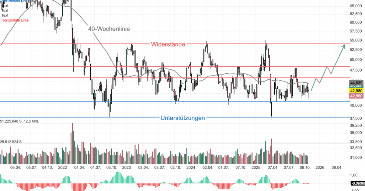Die Aktie von BASF (BAS) bewegt sich seit einiger Zeit in einer breiteren Seitwärtsrange. Die obere Begrenzung dieser Range, der Hauptwiderstand, liegt im Bereich um 55 Euro. Weitere wichtige Widerstände sind bei etwa 46 und 48 Euro zu sehen, die in der Vergangenheit mehrfach angelaufen wurden. Die wichtigste Unterstützung auf Wochensicht liegt im Bereich um 41 Euro. Dieser Bereich scheint eine solide Basis zu bilden, von der aus die Aktie in der Vergangenheit wieder nach oben abprallen konnte. Der Slow Stochastic-Indikator befindet sich aktuell im unteren Bereich, was bedeutet, dass die Aktie nicht überkauft ist und potenziell Raum für eine Erholung nach oben hat. Kann die 40-Wochenlinie nachhaltig überwunden werden, sind die nächsten Ziele die Widerstände bei 46 und 48 Euro, gefolgt von der oberen Begrenzung der Handelsspanne bei 55 Euro.