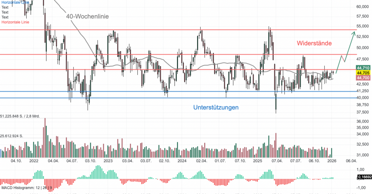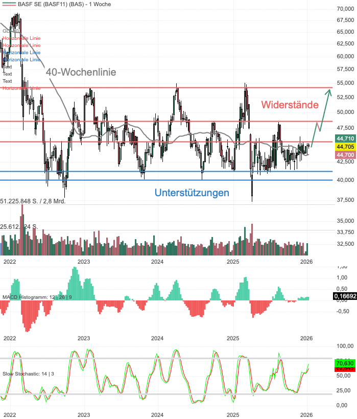 Seit 2022 bewegt sich die Aktie von BASF (BAS) in einem ausgeprägten Seitwärtskanal. Die Zone zwischen 48,00 und 54,00 Euro deckelt den Kurs massiv. Ein nachhaltiger Ausbruch über 54,00 Euro wäre ein starkes Kaufsignal. Die Marke von 40/41 Euro hat sich als "Betonboden" erwiesen. Hier griffen Käufer in der Vergangenheit zuverlässig zu. Die graue Linie im Chart ist die 40-Wochenlinie (entspricht der 200-Tage-Linie). Aktuell notiert der Kurs bei 44,70 Euro leicht über dieser Linie und knapp unterhalb des Widerstands bei 45,58 Euro. Das deutet auf eine neutrale bis leicht konstruktive Stimmung hin. Der Slow Stochastik-Indikator steht bei rund 70 Punkten und steigt. Er nähert sich der "überkauften" Zone, was kurzfristig auf ein begrenztes Aufwärtspotenzial hindeutet, bevor eine kleine Verschnaufpause fällig sein könnte.