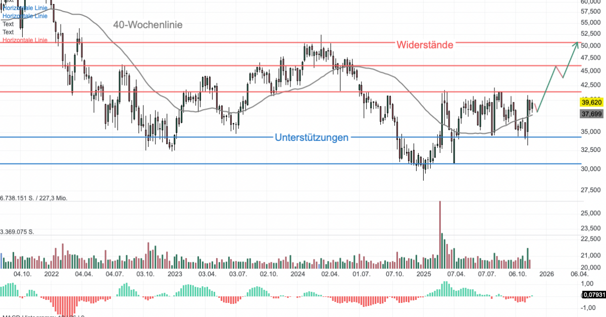 Bevorzugtes Szenario: Long-Einstieg über 41,50 Euro, SL unterhalb von 34,50 Euro.