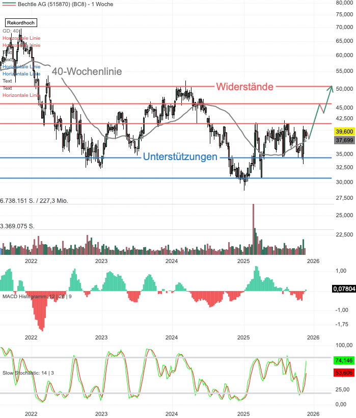 Der deutliche Kurssprung nach den Quartalszahlen vom 14. November hat die Aktie von Bechtle (BC8) über die 40-Wochenlinie befördert. Die Kurse stoßen im Bereich um 41,50 Euro auf einen massiven Widerstand. Dieser Bereich wurde im heurigen Jahr mehrmals getestet, konnte aber nicht überwunden werden. Ein nachhaltiger Ausbruch über dieses Niveau wäre ein sehr starkes Kaufsignal. Eine klare Unterstützung liegt im Bereich von 34,50 Euro. Hier hat sich der Kurs in der Vergangenheit stabilisiert. Das absolute Tief im Chart lag unter 30 Euro. Der Kurs notiert aktuell im oberen Drittel der jüngsten Handelsspanne und testet die 40-Wochenlinie von oben als Unterstützung, nachdem diese zurückerobert wurde. Der Slow Stochastik-Indikator tendiert nach oben, nachdem er aus dem überverkauften Bereich eine starke Aufwärtsbewegung hingelegt hat. Dies deutet auf eine anhaltende Kaufkraft hin.