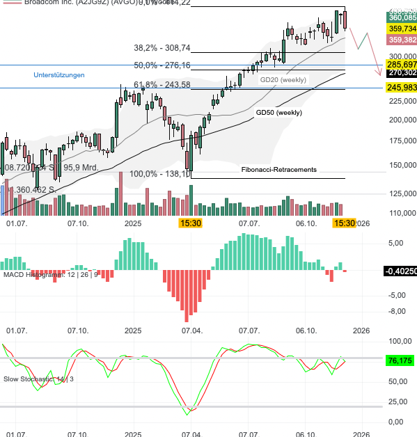 Aus charttechnischer Sicht geriet Broadcom nach der Bekanntgabe der Quartalszahlen deutlich unter Druck. Es deutet sich die Bildung eines neuen lokalen Hochs und einer damit einhergehenden mittelfristigen Korrekturbewegung an. Ich bleibe an der Seitenlinie und nutze den derzeitigen Kursrücksetzer nicht für Einstiege. Die nächsten (potenziellen) Korrekturziele lassen sich anhand der Fibonacci-Retracements ermitteln. Diese befinden sich bei 276 USD und 243 USD. In dieser Zone befindet sich ebenfalls der GD50 (weekly) sowie relevante Horizontal-Unterstützungen. Das Verhalten in der Slow-Stochastik stützt das Korrektur-Szenario. Der Oszillator signalisiert einen massiv überkaufte Situation und generierte erste Verkaufssignale. Zudem wurde im MACD-Histogramm ebenfalls ein Verkaufssignal erzeugt.