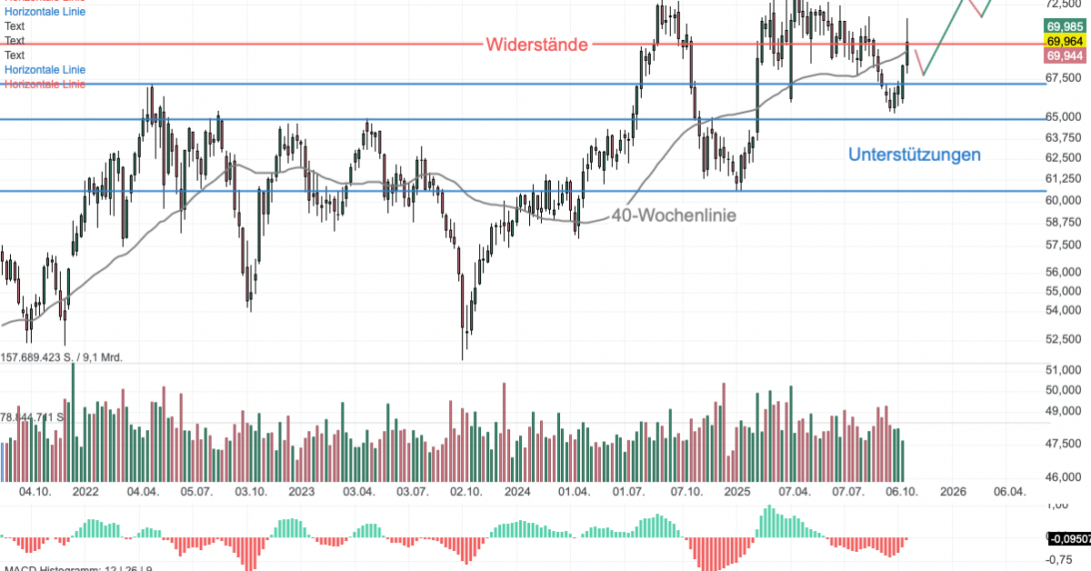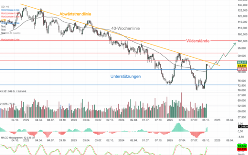 Der Chart zeigt, dass sich die Aktie von Coca-Cola (KO) seit Anfang 2022 in einem übergeordneten Aufwärtstrend befindet, obwohl es zwischenzeitlich zu längeren Korrektur- und Konsolidierungsphasen kam. Der Kurs hat mehrmals versucht, das Rekordhoch zu durchbrechen, was aktuell die wichtigste Hürde darstellt. Die Hauptunterstützungszone, die den langfristigen Trend absichert, liegt bei etwa 65 USD. Solange der Kurs über dieser Zone notiert, ist die langfristige Struktur intakt. Der Slow Stochastic-Indikator befindet sich im Moment im unteren bis mittleren Bereich und zeigt nach einem Rücksetzer wieder aufwärts. Dies deutet darauf hin, dass Raum für eine Aufwärtsbewegung besteht. Der entscheidende Punkt ist der Ausbruch über die Widerstandszone bei 74 USD. Ein Unterschreiten der Hauptunterstützung bei rund 65 USD würde eine deutliche Eintrübung des charttechnischen Bildes bedeuten.