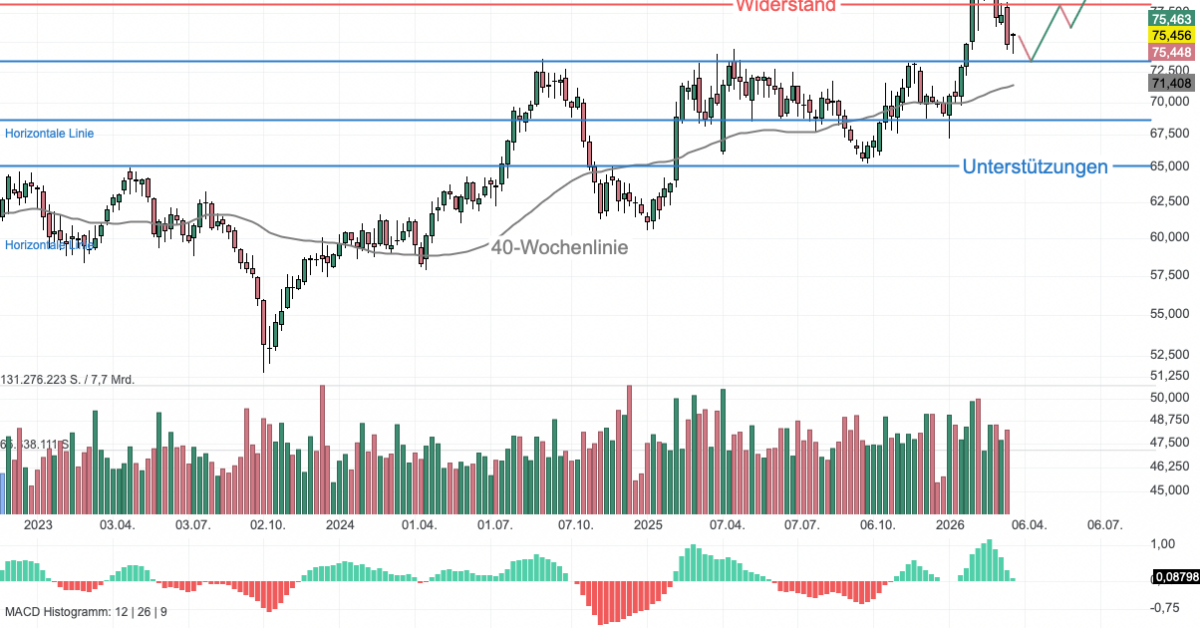 Die Aktie von Coca-Cola (KO) hat von Oktober 2023 eine starke Aufwärtsbewegung hinter sich, befindet sich aber aktuell in einer Korrekturphase. Das Papier des Getränkeriesen notiert über der 40-Wochenlinie, was den langfristigen Bullenmarkt bestätigt. Bei 82 USD befindet sich das Rekordhoch. Der Bereich um 78 USD fungiert aktuell als Widerstand, an dem der Kurs zuletzt abgeprallt ist. Die erste wichtige Auffangzone liegt bei rund 73 USD. Ein tieferer Support findet sich im Bereich von 68,50 und danach 65 USD, falls sich die aktuelle Korrektur ausweiten sollte. Das MACD-Histogramm ist positiv, flacht aber ab, was auf ein nachlassendes Momentum hindeutet. Der Slow Stochastic-Indikator kommt von einem überkauften Niveau herunter und signalisiert momentan eine beginnende Drehung, was Platz für neue Käufer schafft. Trader, die auf einen Bounce setzen, können ein knappes Stopp-Level wählen.