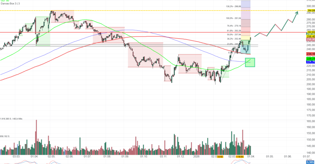 die Aktie der Deutsche Börse AG (WKN: 581005) brach zuletzt bei rund 252,50 Euro aus einer mehrtägigen Konsolidierung aus. Diese entstand im Zuge einer Erholungsbewegung, die die Aktie zurück über den GD200 brachte. Dieser wurde erfolgreich getestet. Bereits zuvor kam es zur Vollendung einer W-Bodenformation, die ein starkes bullisches Signal darstellt. Nach dem erfolgreichen Ausbruch über die Nackenlinie bei rund 234 Euro konnte die Aktie direkt einen Widerstand überwinden. Der MACD lieferte erneut ein Kaufsignal. Ziele auf der Oberseite liegen bei 281,00 Euro sowie 294,20 Euro. Ein Test des 61,8 % Fibonacci-Levels bei rund 263/264 Euro fungiert aktuell als Hürde. Der Stop-Loss sollte eng bei 234,00 Euro platziert werden, da hier das bisherige Ausbruchsniveau verläuft. Das CRV liegt bei ca. 2 : 1.