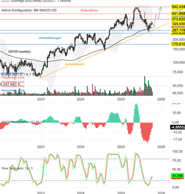 Aus charttechnischer Sicht befindet sich die Aktie von Duolingo innerhalb eines übergeordneten Aufwärtstrends. Im Zuge der jüngsten, schärferen Korrektur steuerte die Aktie lediglich die Unterstützung von 245 bis 267 USD an, welche durch den GD100 (weekly) sowie der langfristigen Aufwärtstrendlinie verstärkt wird. Im Zuge dieser untergeordneten Korrektur wurde die massiv überkaufte Situation in der Slow Stochastik abgebaut. Solange die Aktie nicht unter diese Unterstützungszone fällt, bleibt das Bild bullisch. Die nächsten Kursziele befinden sich bei 373 USD, gefolgt von 441 und 542 USD. Fällt die Aktie hingegen unter 245 USD, droht eine ausgedehnte Korrektur bis 175 USD.