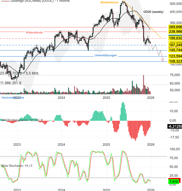 Aus charttechnischer Sicht musste die Aktie von Duolingo in der laufenden Korrekturbewegung trotz der starken Zahlen bereits rund 70% seiner Marktkapitalisierung einbüßen. Der Abwärtstrend ist dabei völlig intakt. Obwohl die Slow Stochastik inzwischen einen massiv überverkauften Zustand signalisiert, bleibe ich ohne nachhaltige Umkehrsignale an der Seitenlinie. Aufgrund er weiterhin hohen Bewertung kann es gerade bei derartigen Wachstumsaktien problemlos zu noch stärkeren Rücksetzern kommen. Fällt Duolingo bspw. unter 167 USD, befinden sich die nächsten Auffangzonen bei 145 USD, gefolgt von 123 und 108 USD. Steigt die Aktie hingegen über das letzte lokale Zwischenhoch bei 199 USD, ist zumindest mit einer größeren Verschnaufpause von der laufenden Korrektur auszugehen. Mit einem Turnaround ist aktuell erst über einem Wert von 270 USD zu rechnen.