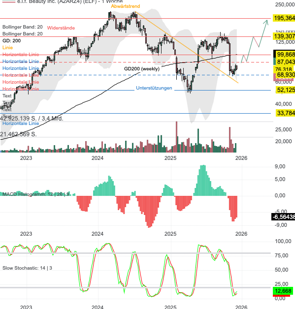 Aus charttechnischer Sicht konnte elf Beauty Anfang/Mitte des Jahres über den Abwärtstrend vom Allzeithoch nachhaltig nach oben ausbrechen. Dies erzeugte ein übergeordnetes (Aufwärts-)Trendfortsetzungssignal. Allerdings scheiterte die Aktie bislang am Widerstand von 140 USD und geriet im Anschluss an die Bekanntgabe der Quartalszahlen deutlich unter Druck. Bislang konnte eine erste Stabilisierung im Unterstützungsbereich von 69 USD eingeleitet werden. Diese Zone wird durch die Oberkante des Abwärtstrend verstärkt. Aktuell handelt es sich um eine Pullback-Bewegung. Gelingt der Anstieg über 87 USD, könnte der übergeordnete Aufwärtstrend wieder aufgenommen werden. Im Anschluss befinden sich die nächsten Kursziele bei 99 USD, gefolgt von 139 und 195 USD. Sollte die Aktie hingegen nachhaltig unter 69 USD fallen, trübt sich das Bild weiter ein.