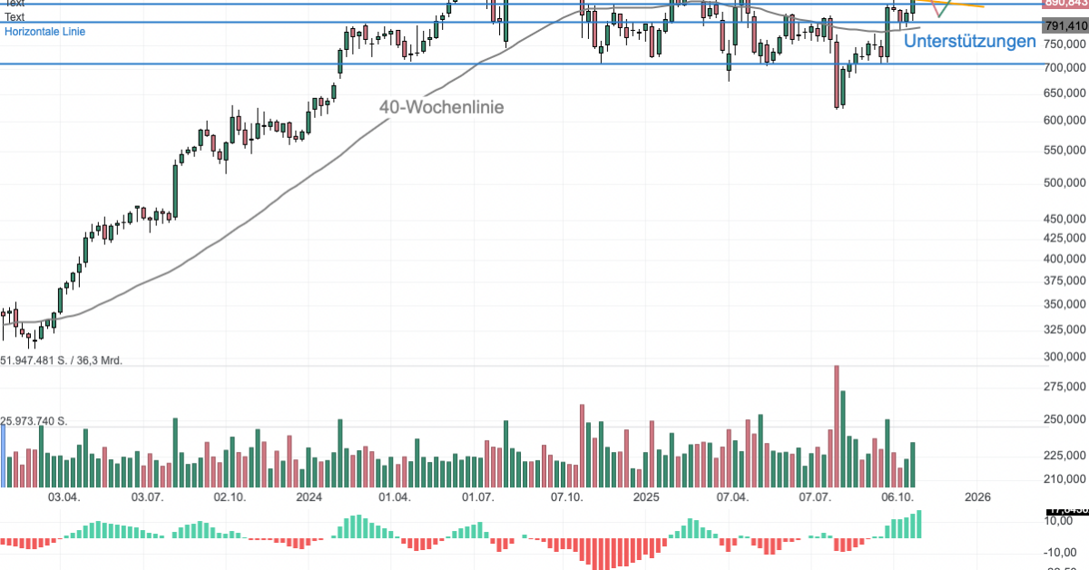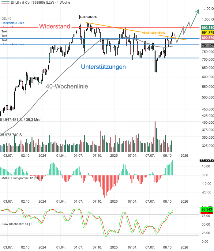 Die Aktie von Eli Lilly (LLY) befindet sich in einem langfristigen Aufwärtstrend. Nach dem Ausbruch über die Abwärtstrendlinie, sehen wir eine klar definierte horizontale Widerstandszone im Bereich von 940 USD. Die Aktie notiert aktuell knapp unterhalb dieses wichtigen Widerstandes. Ein Ausbruch über diese Linie, insbesondere über das Rekordhoch, wäre ein sehr starkes Kaufsignal. Die jüngste und wichtigste Unterstützung ist nach der orangen Trendlinie der Bereich der 40-Wochenlinie, welche als dynamische Unterstützung dient. Der Slow Stochastic-Indikator ist stark angestiegen und befindet sich im überkauften Bereich. Dies deutet auf eine hohe kurzfristige Dynamik hin, mahnt aber auch zur Vorsicht vor einem möglichen Rücksetzer. Ein temporärer Rückfall unter die Abwärtstrendlinie wäre möglich. Ein Wochenschlusskurs unter der 40-Wochenlinie ist als Alarmsignal zu werten.