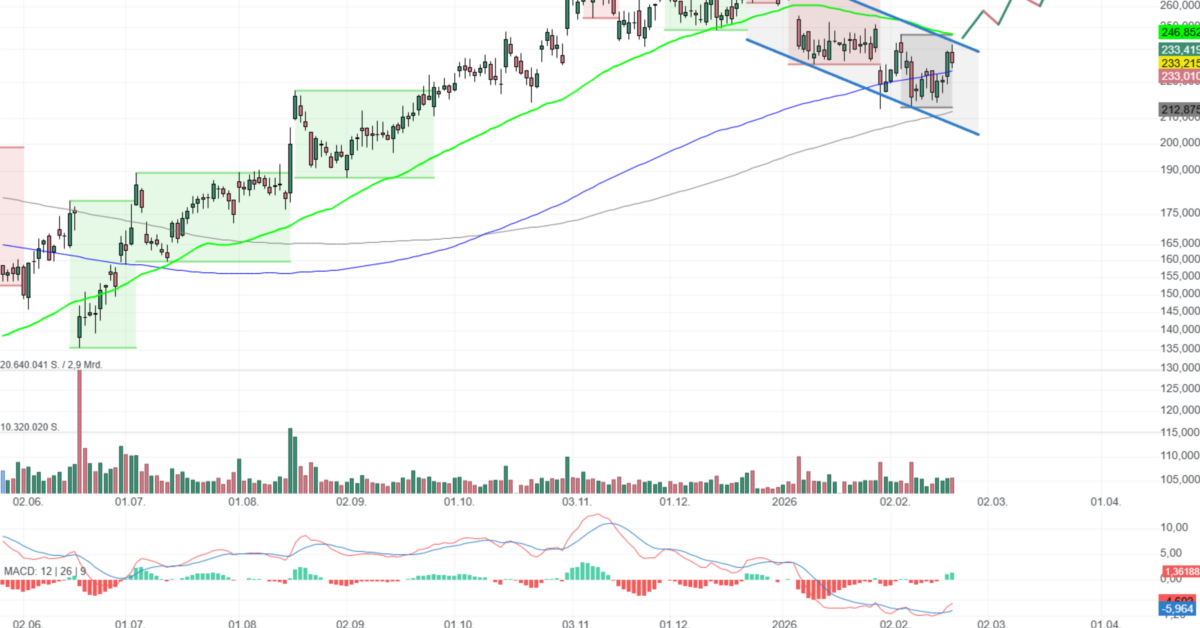die Aktie von First Solar (WKN: A0LEKM) triggert bereits vor den Quartalszahlen am 24. Februar ein Kaufsignal im MACD und bereitet den Ausbruch aus der Konsolidierung vor. Der RSI befindet sich um neutralen Bereich und hat ausreichend Luft nach oben. Der Trigger könnten dann wirklich positive Quartalszahlen sein, da bereits andere Unternehmen der Branche in der laufenden Earnings-Saison positive Nachrichten vermeldeten. Die Aktie konnte den Aufwärtstrend an der Unterstützung des GD200 halten. Der Kurs befindet sich allerdings unter dem GD50, der noch abfällt. Wichtig wäre nun ein Überschreiten des Abwärtstrendkanals und des GD50 (ca. 247 USD). Dann wäre der Weg frei zum Gap-Close bei 268,28 USD und zum 52-Wochenhoch bei 285,99 USD. Ein Stop bietet sich unter dem GD200 bei 212 USD an. Das CRV liegt im Best Case bei ca. 2,5 : 1.