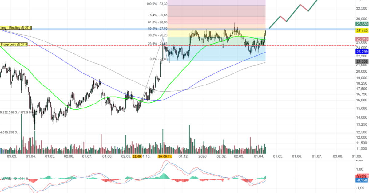 Bevorzugtes Szenario: Stop Buy bei 28 USD. SL bei ca. 24,50 USD (unter GD50).
