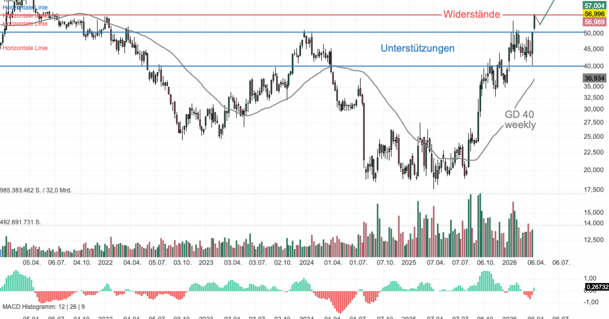 Der Kurs der Aktie von Intel (INTC) notiert aktuell deutlich über dem gleitenden Durchschnitt der letzten 40 Wochen, was den mittelfristigen Aufwärtstrend bestätigt. Nach einer langen Bodenbildungsphase in den Jahren 2024/25 hat die Aktie massiv an Fahrt gewonnen. Besonders im März/April sehen wir einen steilen Anstieg, der den Kurs in Richtung der wichtigen Marke von 56 USD katapultiert hat. Historisch gesehen ist dies ein Bereich, in dem Verkäufer in der Vergangenheit das Ruder übernommen haben. Ein nachhaltiger Ausbruch darüber würde den Weg in Richtung 69 USD und langfristig rund 75 USD ebnen. Sollte es zu einer Korrektur kommen, bietet die Zone um 50 USD (ehemaliger Widerstand, jetzt Support) sowie die massive Unterstützung bei 40 USD Sicherheit. Intel wird am 23. April 2026 die Ergebnisse für das 1. Quartal vorlegen.