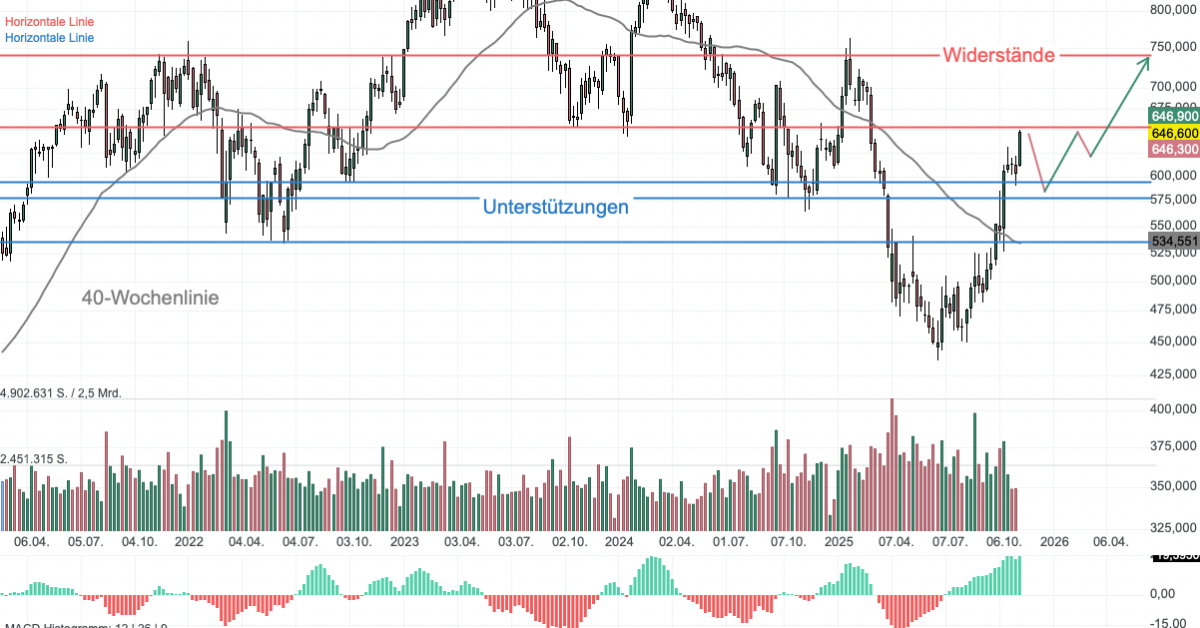 Bevorzugtes Szenario: Long-Einstieg bei 600 Euro, SL unter 530 Euro.
