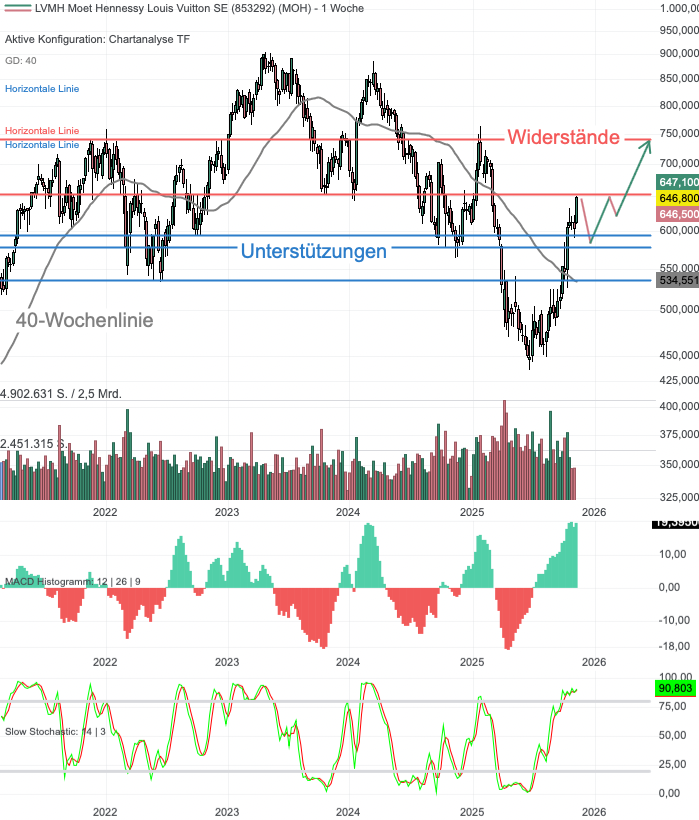 Die Aktie von LVMH (MOH) befand sich nach einem starken Aufwärtstrend von 2022 bis Anfang 2023 massiv unter Druck. Seit den Tiefs um die 450-Euro-Marke im Sommer dieses Jahres hat die Aktie eine steile Erholung eingeleitet. Aktuell notiert das Papier knapp unterhalb des Widerstandes bei rund 650 Euro. Die 40-Wochenlinie wurde bereits zuvor von unten nach oben durchbrochen und bietet nun eine dynamische Unterstützung. Nach 650 Euro liegt ein entscheidender Widerstandsbereich bei 750 Euro. Dies ist eine Zone, von der die Aktie mehrfach nach unten abprallte. Das Überwinden wäre ein sehr bullisches Signal. Zwischen 575 und 595 Euro befindet sich eine Unterstützungszone. Der stark überkaufte Slow Stochastic-Indikator notiert bei 90. Dies zeigt, dass die aktuelle Aufwärtsbewegung sehr stark war und ein Rücksetzer wahrscheinlich werden könnte, um die Überhitzung abzubauen.