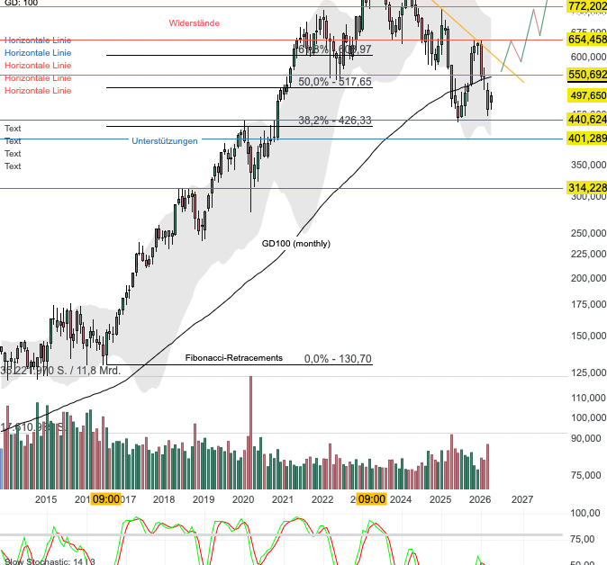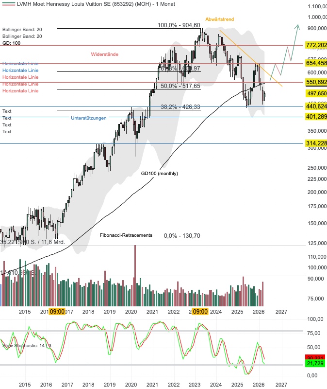 Aus charttechnischer Sicht befindet sich LVMH in einem übergeordneten Aufwärtstrend. Allerdings ging die Aktie nach Erreichen des Allzeithochs bei ca. 905 Euro im Jahre 2023 in eine mehrjährige Korrektur über. Im Zuge dieser Korrektur ist ein Abwärtstrend entstanden. Grundsätzlich gilt: solange dieser nicht nachhaltig nach oben durchbrochen wird, ist mit weiter fallenden Kursen zu rechnen. Allerdings steuerte die Aktie zuletzt die Unterstützung bei 440 Euro in Kombination zum Bereich des 38,2er Fibonacci-Retracements an. Eine erste Gegenbewegung konnte eingeleitet werden, welche jedoch wieder vereitelt wurde. Es deuten sich jedoch erste, übergeordnete Stabilisierungstendenzen an. Das Bild hellt sich auf, wenn LVMH über 550 Euro ansteigt. Hier befinden sich relevante Widerstände in Kombination zum Abwärtstrend sowie dem GD100 (monthly). Gelingt der Breakout, könnte die Aktie recht schnell die nächsten Zielzonen bei 655, 770 und 1.000 Euro ansteuern. Kann sich LVMH allerdings nicht in der Zone von 400 bis 440 Euro stabilisieren, droht ein weiterer Abverkauf.