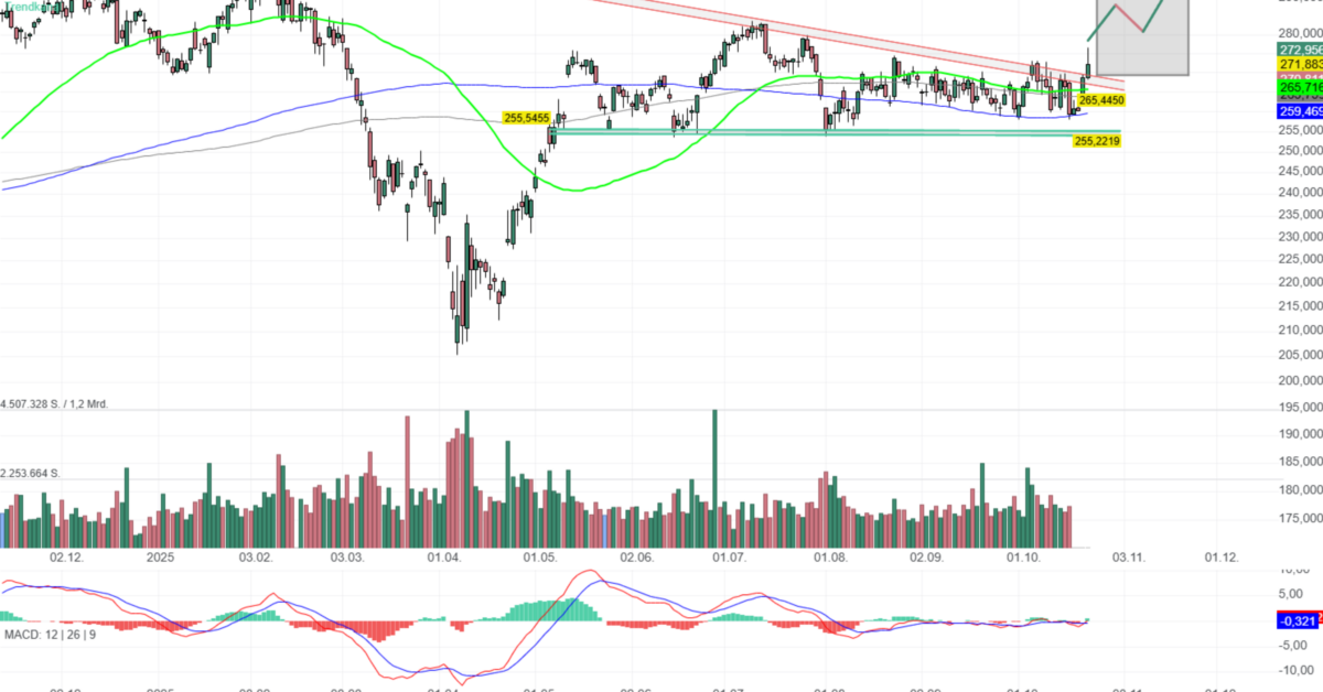 die Aktie von Marriott International (WKN: 913070) präsentiert sich nach längerer Seitwärtsphase unmittelbar vor einem markanten charttechnischen Signal. Im Tageschart wurde eine über Monate ausgebildete Dreiecks- und Abwärtstrendstruktur nun nach oben durchbrochen. Der dynamische Ausbruch über die Widerstandszone um 272 USD wird von einem steigenden Handelsvolumen begleitet und aktiviert ein technisches Kaufsignal. Bestätigt wird das Setup durch den MACD, der gerade ein bullisches Kaufsignal sendet, und einen RSI, der sich bei rund 58 befindet, was zusätzlichen Spielraum für weiter steigende Kurse bietet. Die gleitenden Durchschnitte der Perioden 50, 150 und 200 unterstützen die Kursstärke: Alle Linien wurden überwunden und dienen nun als Unterstützung. Bleibt die Aktie nachhaltig über 272 USD, eröffnet sich Potenzial bis in den Bereich von 295 bis 305 USD – mit Einstiegschancen dank attraktivem CRV, bei einem Stop unter 259 USD.