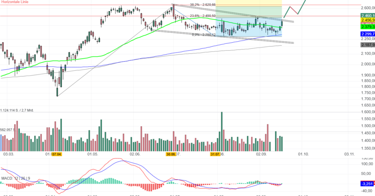 die Aktie von Mercadolibre (WKN: A0MYNP) generiert inmitten der Konsolidierung ein neues MACD-Kaufsignal. Übergeordnet befindet sich die Aktie im Aufwärtstrend. Am Mittwoch (17. September) schaffte es die Aktie zurück über den GD50. Wichtig war, dass die Aktie im Septmber erstmal kein neues Tief markierte. Auch der RSI bricht im neutralen Bereich den jüngsten Abwärtstrend. Auf der Oberseite warten bei 2.508 USD und 2.643 USD Widerstände. Werden diese überwunden, lassen sich aus den Fibonacci Extensions Ziel bei 2.725 USD, 2.830 USD, 2,960 USD und 3.170 USD ableiten. Bei einem Stop unter dem GD50 liegt das CRV im Best Case bei satten 9:1. An den genannten Marken bieten sich Teilgewinnmitnahmen an.